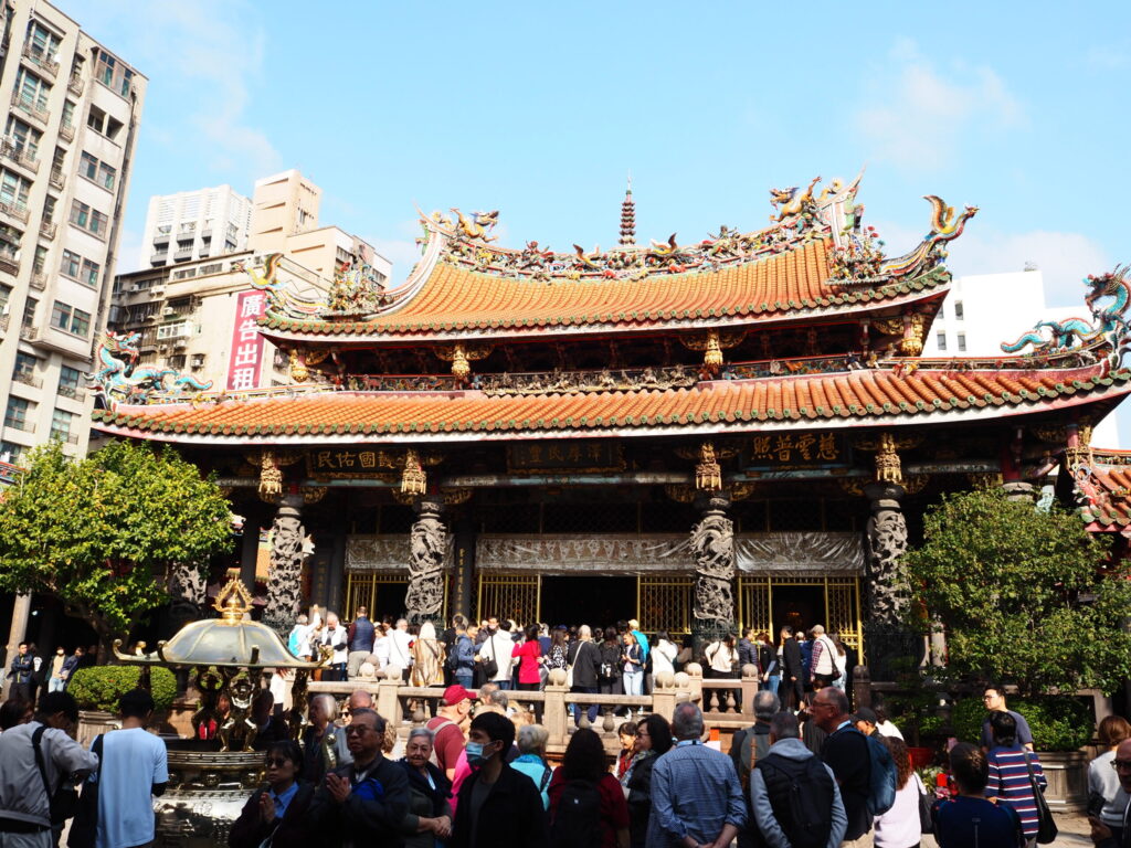 次に訪れるのは、台北最古の寺院として知られる 龍山寺。1738年創建の歴史ある寺院で、仏教・道教・民間信仰の神様が祀られています。
