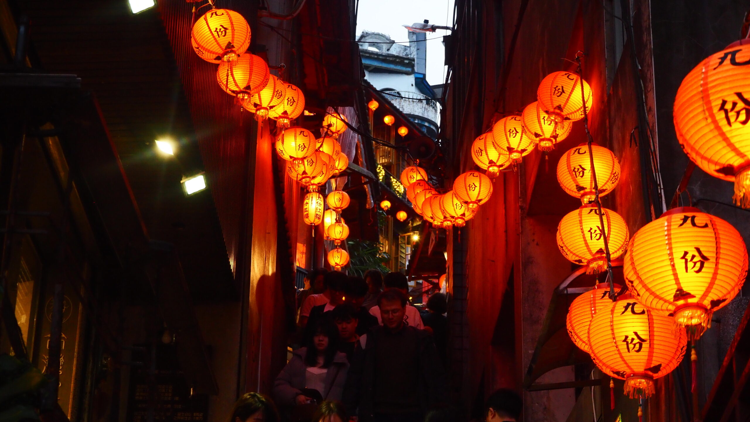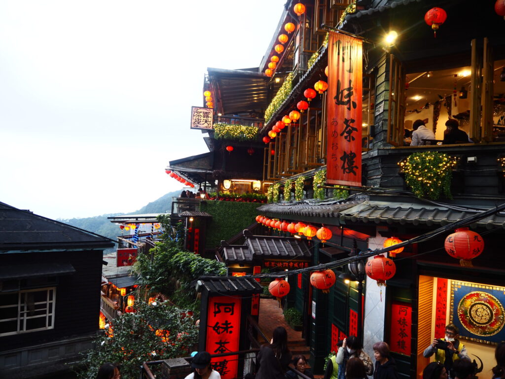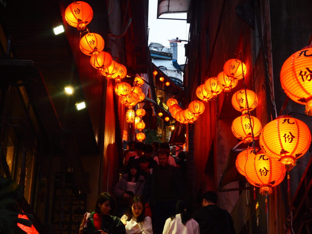 九份の最大の見どころは、赤い提灯が連なるノスタルジックな街並み。夕暮れから夜にかけてライトアップされる時間帯は、まるで映画のワンシーンのような幻想的な雰囲気に包まれます。